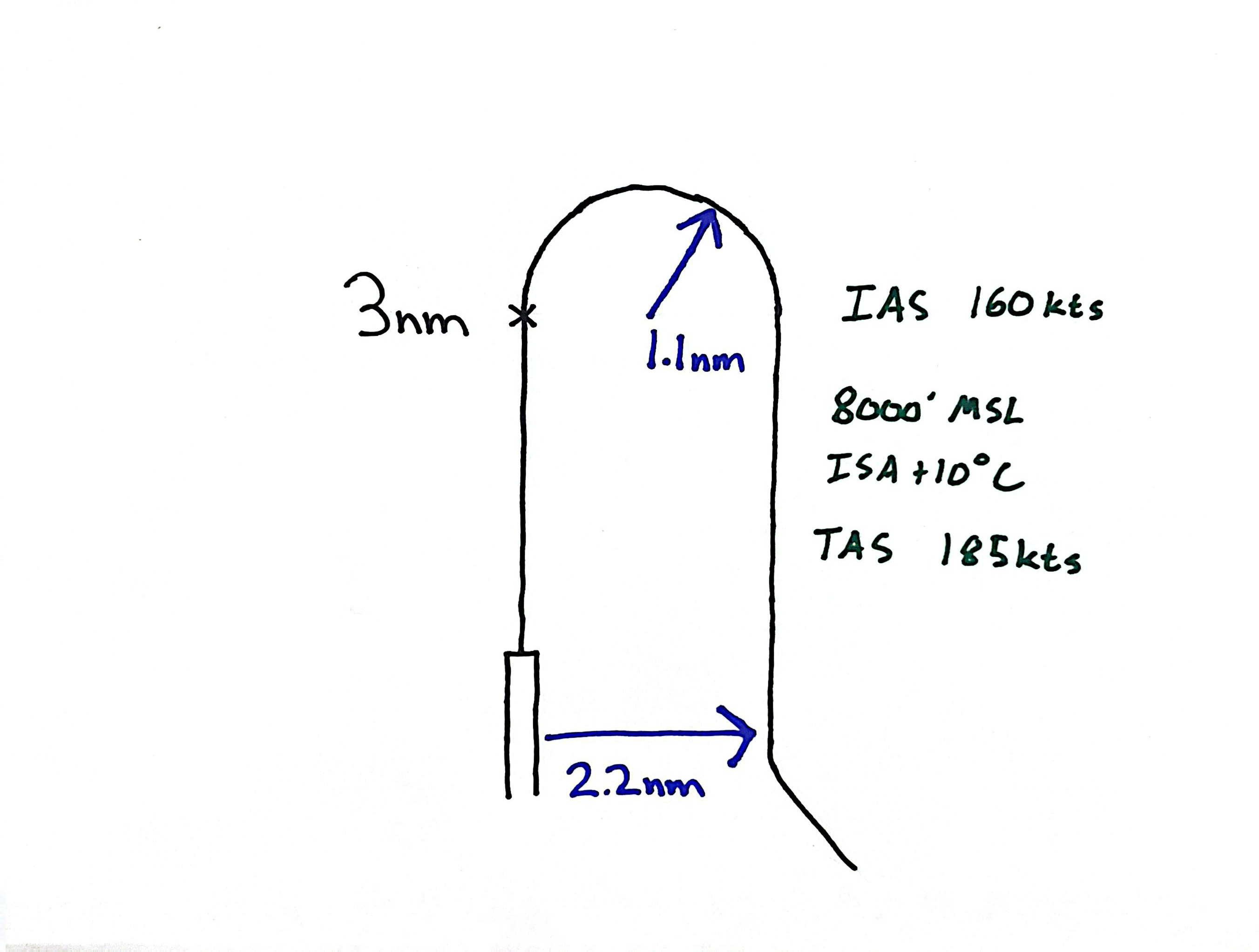 Sometimes we end up on a longer downwind than 3 miles. In the case of a 5nm downwind, we must be atleast 2.9nm wide or 4.3nm wide in the case of wind.