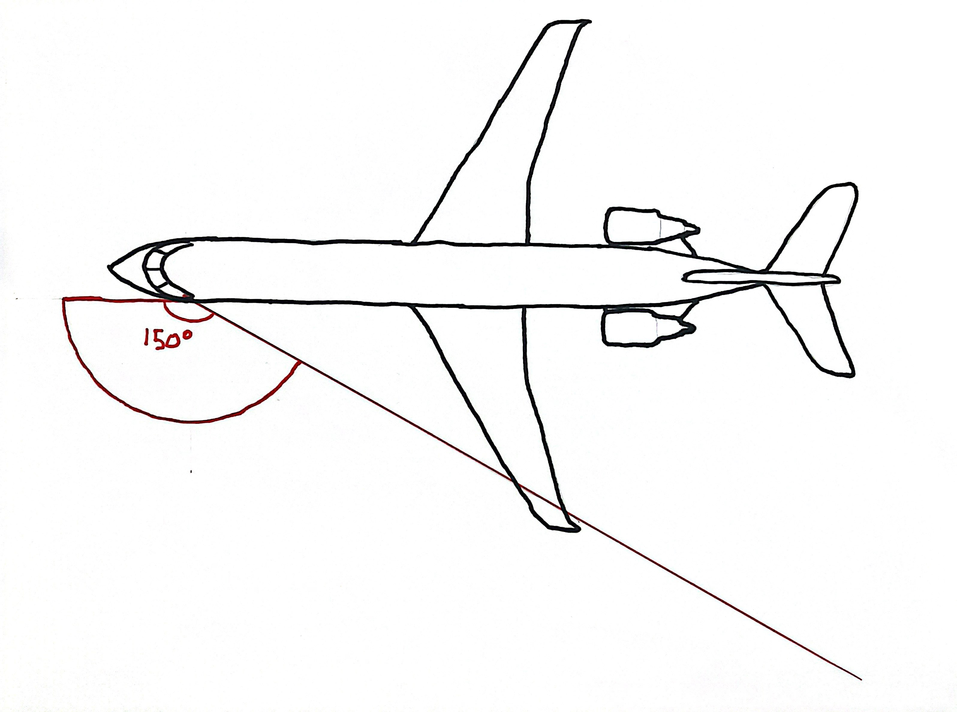 I know that when I lean into the side window, the farthest back I can see is the aircraft's winglets. Looking at a topdown view of the aircraft with a protractor, I measure 150° on both sides.